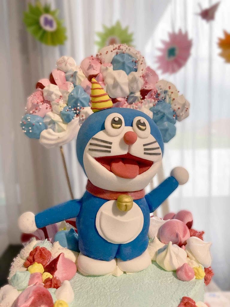 DoraemonBaking Doraemon themed cake. Buttercream frosting, meringues decorations and a hand made Doraemon sugar paste figure.