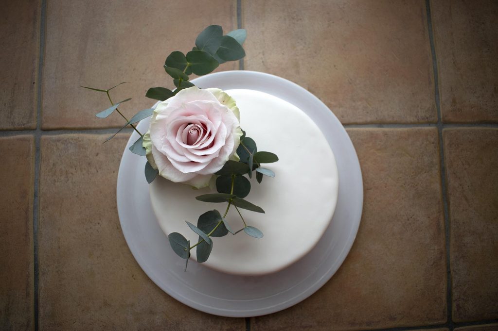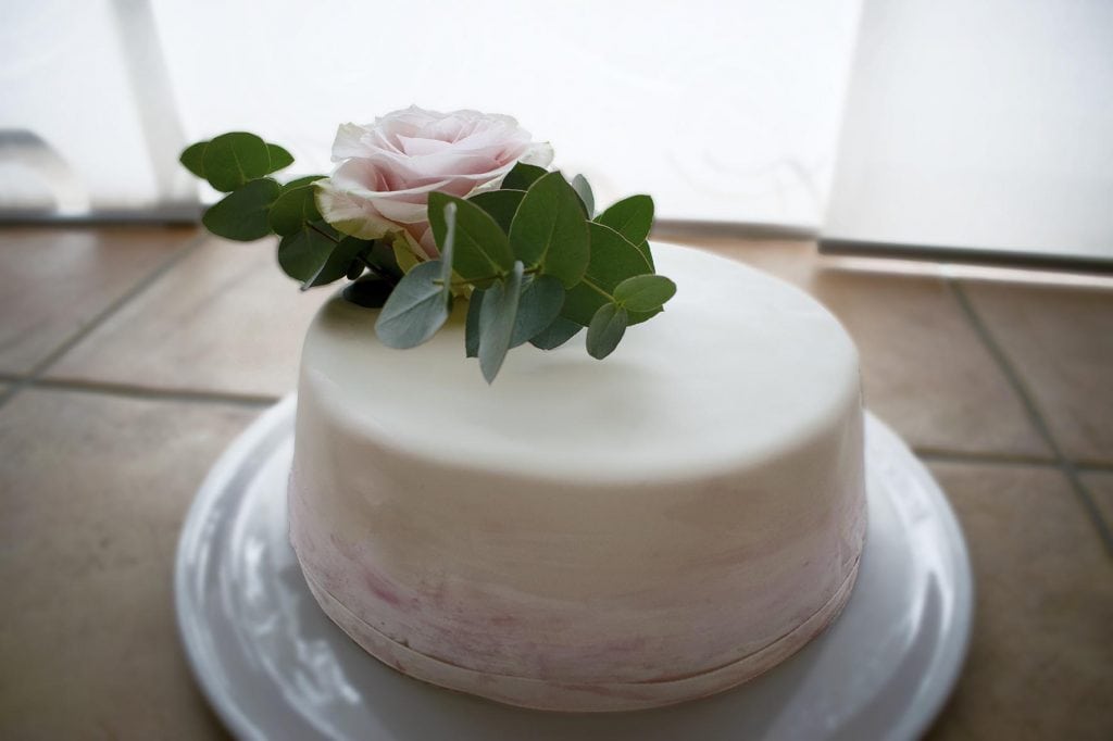 White and pinkBaking White and pink. White sugar paste, pink edible glitter, a rose and eucalyptus leaves.